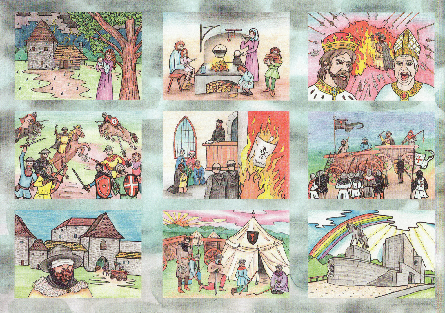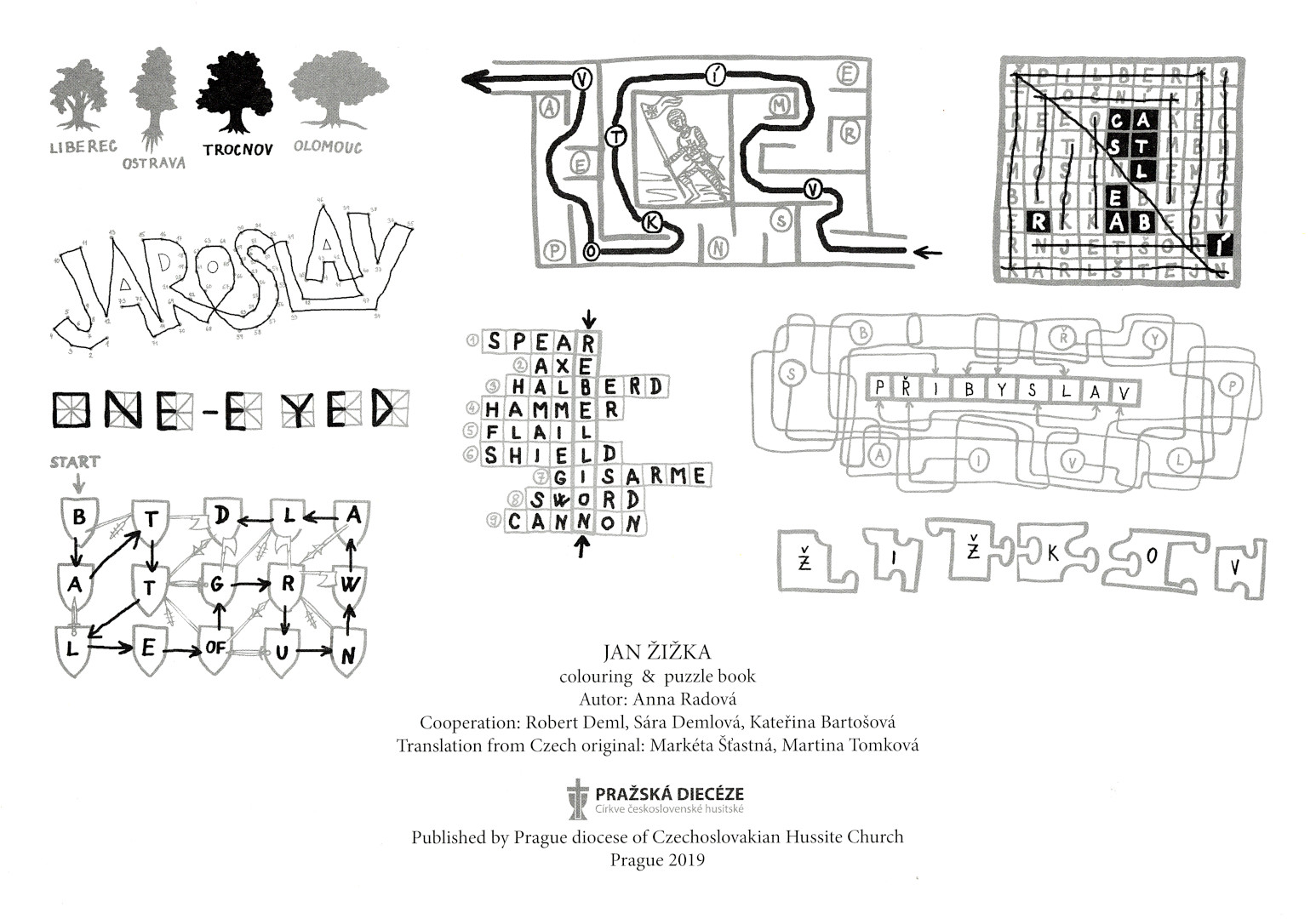 Colouring book with secrets and deciphering for children, depicting the person of Jan Žižka.